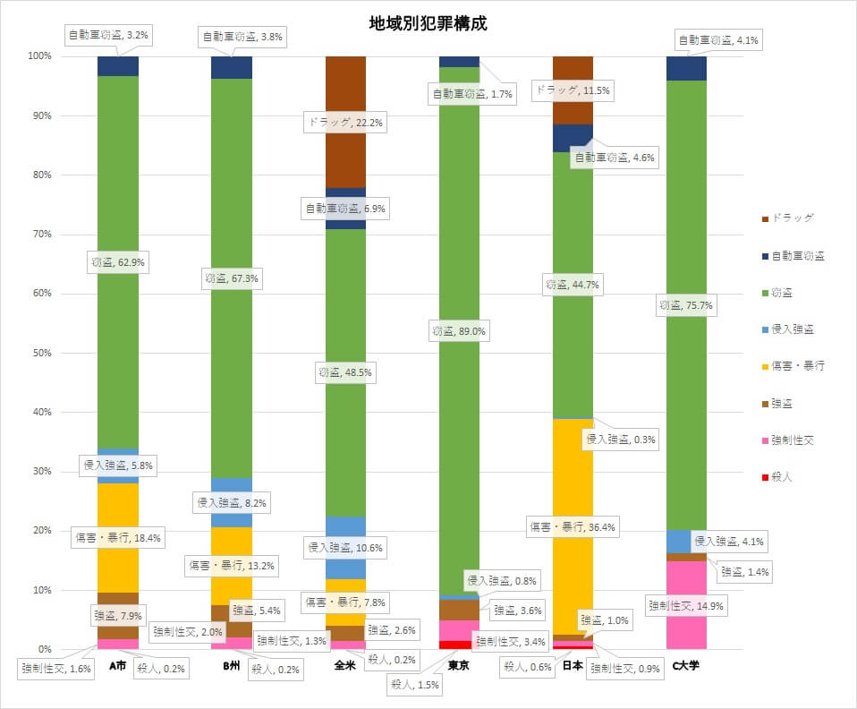 地域ごとの犯罪構成を比較します。どんな犯罪が多いかを知ることで、気を付けるべきことがわかります。